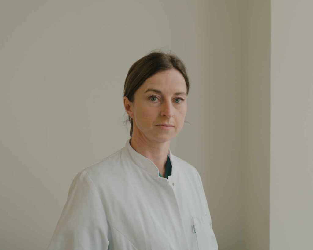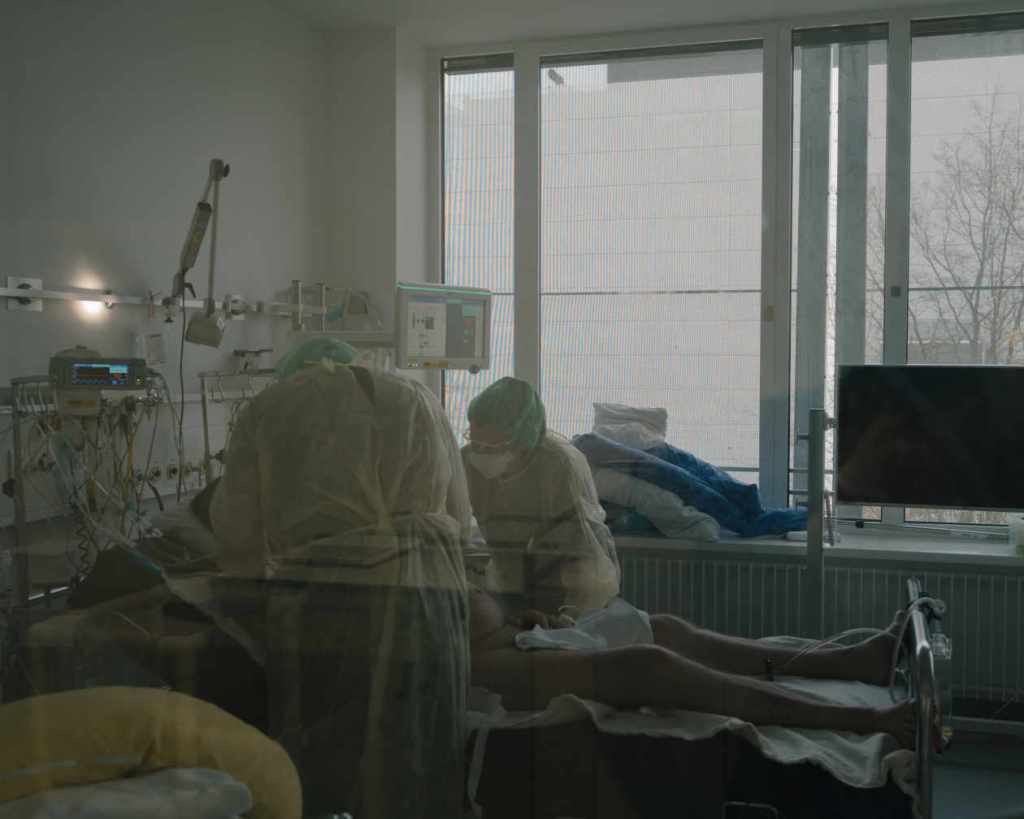A quelques couloirs des bureaux de la direction, l’atmosphère est tout autre dans l’unité de soins intensifs que dirige Ines Schröder. Ici, ce n’est que vêtu d’une blouse spéciale qu’on est autorisé à pousser la lourde porte d’entrée, sur laquelle est écrit « interdit aux visiteurs » et où a été collé un panneau « stop ».