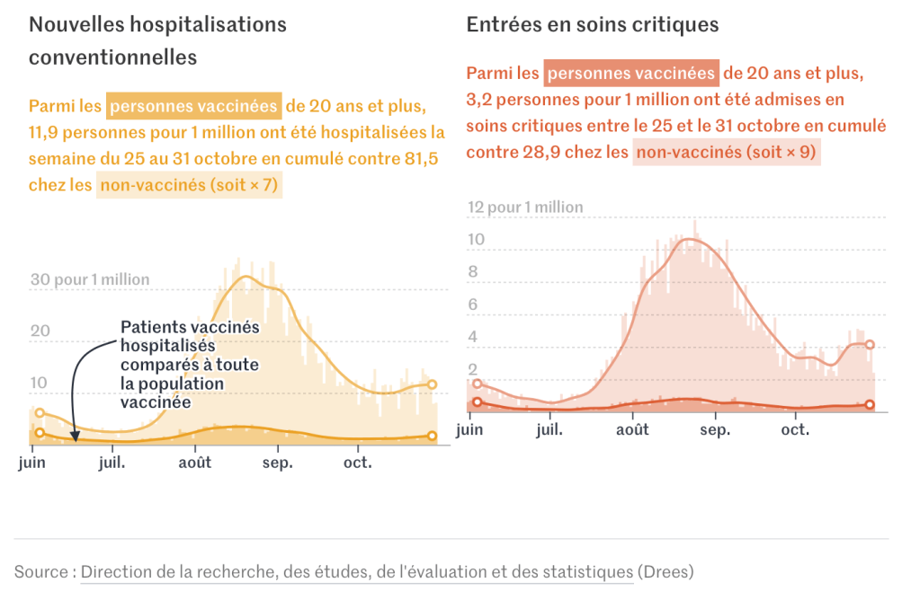 Enfin, la hausse des contaminations dans les pays fortement vaccinés est-elle conséquente à une faible efficacité des vaccins ? Plusieurs études solides ont démontré une efficacité de plus de 90 % des vaccins sur les formes graves et les décès liés au Covid-19. Récemment, en octobre, une vaste étude françaiseconfirmait que les immunisés de plus de 50 ans avaient neuf fois moins de risque d’hospitalisation ou de mourir du Covid-19 que les non-vaccinés.