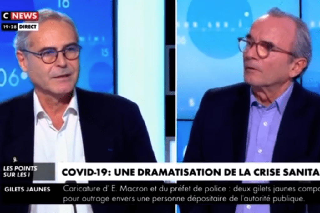 Christian Perronne (à gauche), face au journaliste Ivan Rioufol, sur la chaîne CNews, a bénéficié d’une tribune d’une vingtaine de minutes, dimanche 21 novembre. FACEBOOK