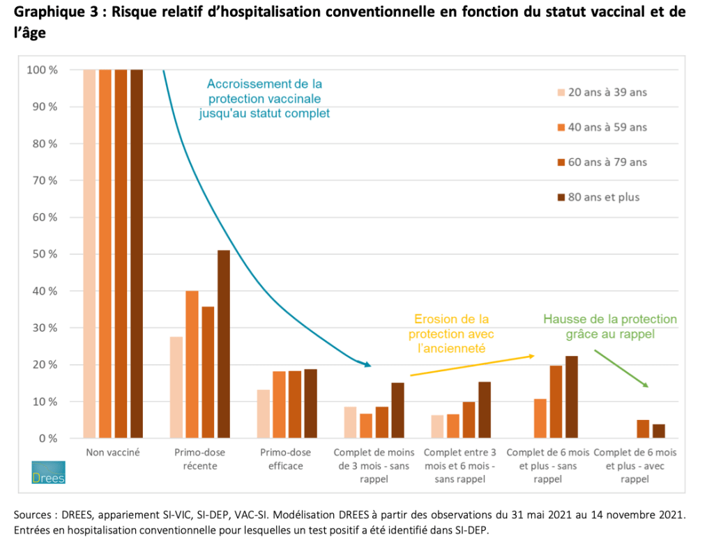 Enfin, un encadré en fin de document explique pourquoi, malgré une protection vaccinale toujours élevée, la proportion de personnes vaccinées entrant à l’hôpital augmente au fur et à mesure du temps en 2021, avec la couverture vaccinale.