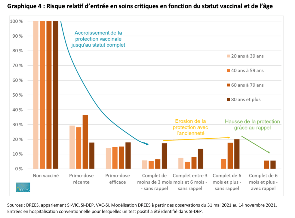 Les données issues des appariements entre SI-VIC, SI-DEP et VAC-SI exploitées par la DREES apportent désormais de nouvelles informations sur l’ancienneté de l’obtention du schéma vaccinal complet et l’injection éventuelle d’un rappel. Outre de premières statistiques descriptives, une modélisation relativement simple est proposée pour estimer conjointement l’effet des différents statuts vaccinaux – en particulier l’effet protecteur du vaccin dans le temps et l’apport de la dose de rappel – en neutralisant des différences de structures par âge.
