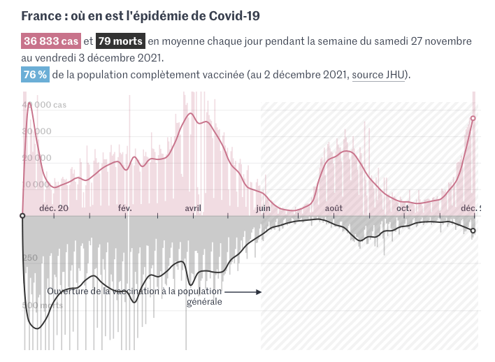 France : où en est l’épidémie de Covid-1936 833 cas et 79 morts en moyenne chaque jour pendant la semaine du samedi 27 novembre au vendredi 3 décembre 2021. 76 % de la population complètement vaccinée (au 2 décembre 2021, source JHU).
