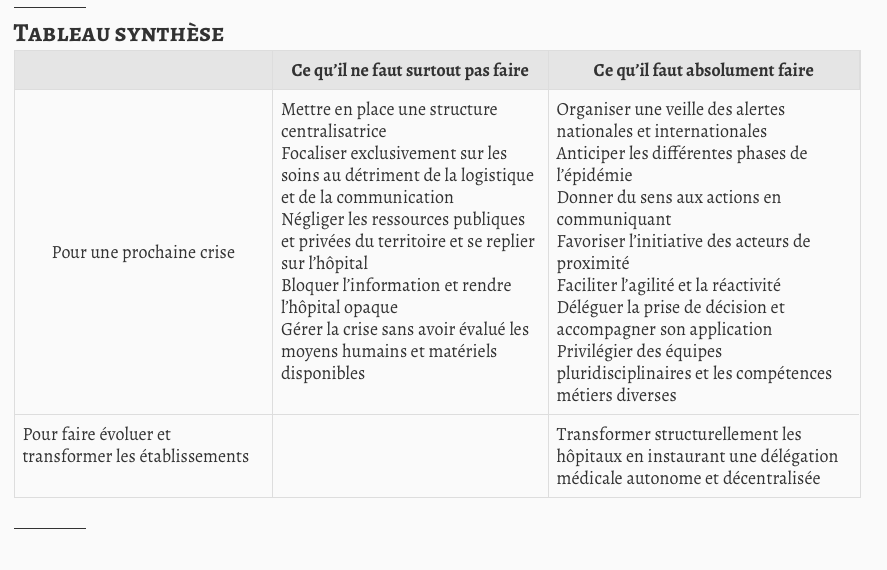 55Les modes d’organisation de gestion de la crise ont transformé le système de santé et l’organisation de l’hôpital : moins de bureaucratie, moins de lourdeurs administratives, des circuits décisionnels courts, une organisation centrée sur le soin, des équipes pluridisciplinaires, une gestion en mode projet…