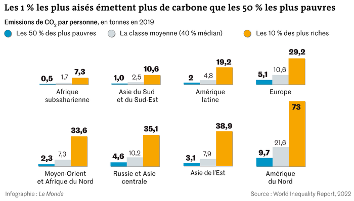 Les disparités de richesse se traduisent aussi par des inégalités en termes d’empreinte écologique. Les pays opulents sont historiquement responsables de l’essentiel des émissions de dioxyde de carbone (CO2). Et, au sein de chaque pays, les ménages aisés sont les plus gros pollueurs. Les principaux émetteurs de la planète sont ainsi les 10 % les plus riches aux Etats-Unis, avec 73 tonnes de CO2par an, contre 9,7 tonnes par an pour les 50 % les plus pauvres. Suivent les 10 % les plus riches d’Asie de l’Est (38,9 tonnes contre 3,1 tonnes pour les plus pauvres). Le fossé est moins grand en Europe (29,2 tonnes contre 5,1 tonnes), et l’Afrique subsaharienne reste la moins émettrice (7,3 tonnes contre 0,5 tonne).