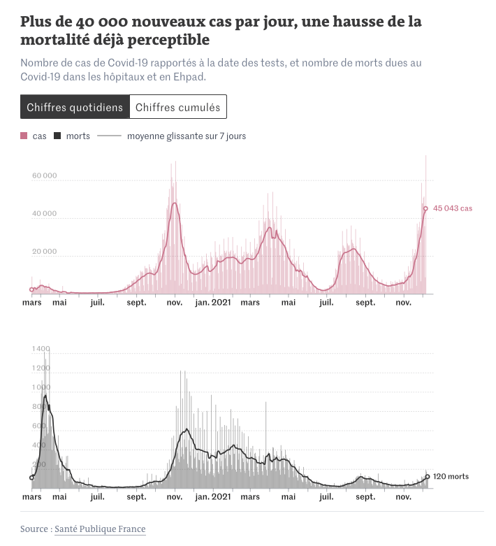 Avec 45 043 nouvelles contaminations au 6 décembre – en moyenne par jour sur les sept jours précédents –, cette cinquième vague a d’ores et déjà dépassé les pics des deux précédentes vagues épidémiques (autour de 24 000 cas à la mi-août et de 35 000 au début d’avril) ; elle se rapproche du pic de novembre 2020 – 47 000 cas quotidiens au début du deuxième confinement.