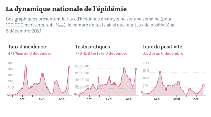 Ce niveau élevé de circulation du virus se traduit par un taux d’incidence de 445 cas pour 100 000 habitants au niveau national au 4 décembre (contre 502 cas pour 100 000 habitants au début de novembre 2020).Plus de 40 000 nouveaux cas par jour, une hausse de la mortalité déjà perceptible