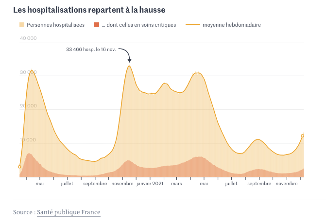 Pour Daniel Lévy-Bruhl, « en matière d’incidence, c’est une vague importante. En matière d’hospitalisation, c’est, à ce stade, une vague beaucoup moins importante que celle à laquelle on aurait pu s’attendre en se basant sur les données d’incidence ». Il précise : « Il y a une dissociation entre la dynamique épidémique liée aux nouvelles infections et la dynamique épidémique liée aux nouvelles hospitalisations, et c’est bien entendu la vaccination qui en est à l’origine. Quand on regarde les courbes, on voit qu’on est au-delà du pic de ce qu’on a appelé la quatrième vague, au-delà du pic de ce qu’on a appelé la troisième vague et très proches du pic de la deuxième vague (à l’automne 2020), avec des capacités de tests déjà importantes à l’époque. En revanche, l’image n’est pas du tout la même quand on regarde la courbe des hospitalisations : on se retrouve à peu près au même niveau que la quatrième vague, qui était une petite vague cet été, et très au-dessous de ce qu’on a observé lors des deuxième et troisième vagues. »
