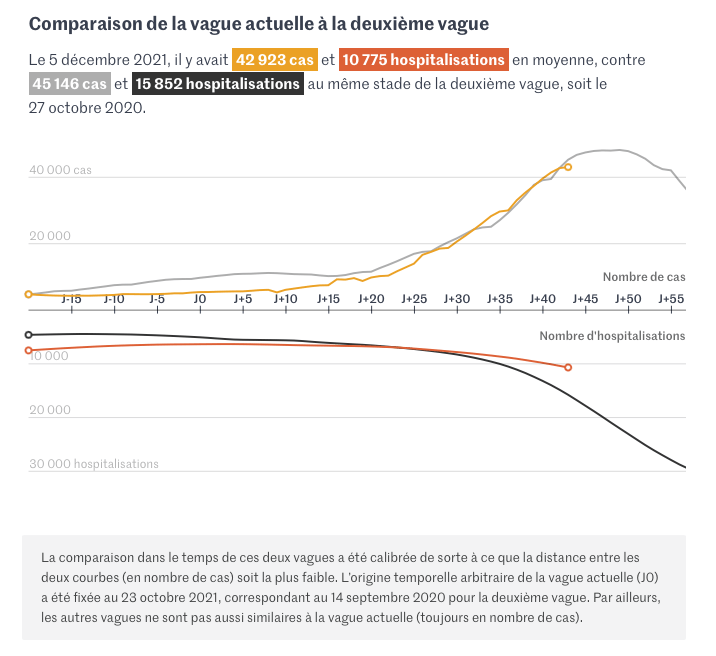 Comparer les vagues est un exercice difficile, notamment parce qu’elles n’ont pas été causées par les mêmes variants, n’ont pas lieu aux mêmes saisons, etc. L’épidémiologiste Mircea Sofonea, chercheur au sein du laboratoire maladies infectieuses et vecteurs de l’université de Montpellier, avance comme causes de cette cinquième vague « le relâchement des gestes barrières, la saison hivernale et les journées plus courtes qui poussent les gens à rester à l’intérieur ou encore l’efficacité vaccinale en baisse au cours du temps ». Surtout, le variant Delta, nettement plus contagieux que les souches qui l’ont précédé, est désormais responsable de la quasi-totalité des infections en France.