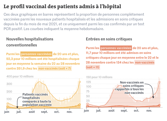« Si on n’avait pas la vaccination aujourd’hui, avec le niveau d’incidence auquel nous sommes, nous ne ferions pas face », note Daniel Lévy-Bruhl. En effet, parmi les personnes hospitalisées, celles qui ne sont pas vaccinées sont 11 fois plus nombreuses en soins critiques que celles qui ont reçu au moins deux doses, selon les données compilées par la direction de la recherche, des études, de l’évaluation et des statistiques. Autrement dit, s’il y avait la même proportion de personnes vaccinées que de personnes non vaccinées admises en soins critiques, il y aurait environ 500 admissions quotidiennes, contre 100 enregistrées en moyenne sur la période considérée, du 15 au 21 novembre.
