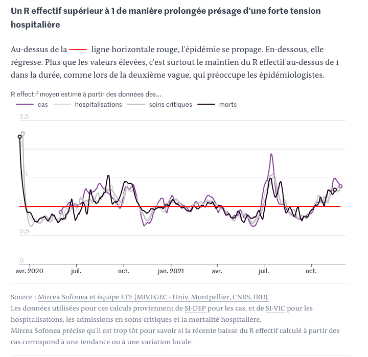 Pour anticiper la dynamique de l’épidémie, un outil utilisé par les épidémiologistes est le R effectif (abrégé « Re », taux de reproduction effectif du virus). On estime qu’un individu porteur du virus contaminait à son tour, en moyenne, à la fin de novembre, 1,35 personne. « Cet indicateur a une validité de deux semaines, il permet de “prévoir” avec dix jours d’avance ce qui va se passer à l’hôpital, en somme », explique Mircea Sofonea, qui ajoute : « La durée de la période pendant laquelle le taux de reproduction est supérieur à 1 est un bon prédicteur de la tension hospitalière à venir. Quand il s’agit d’un jour ou deux, l’impact sur l’hôpital n’est pas conséquent. Si, en revanche, ce nombre est consolidé sur une semaine, on peut commencer à prévenir les hôpitaux que les admissions vont fortement augmenter. »