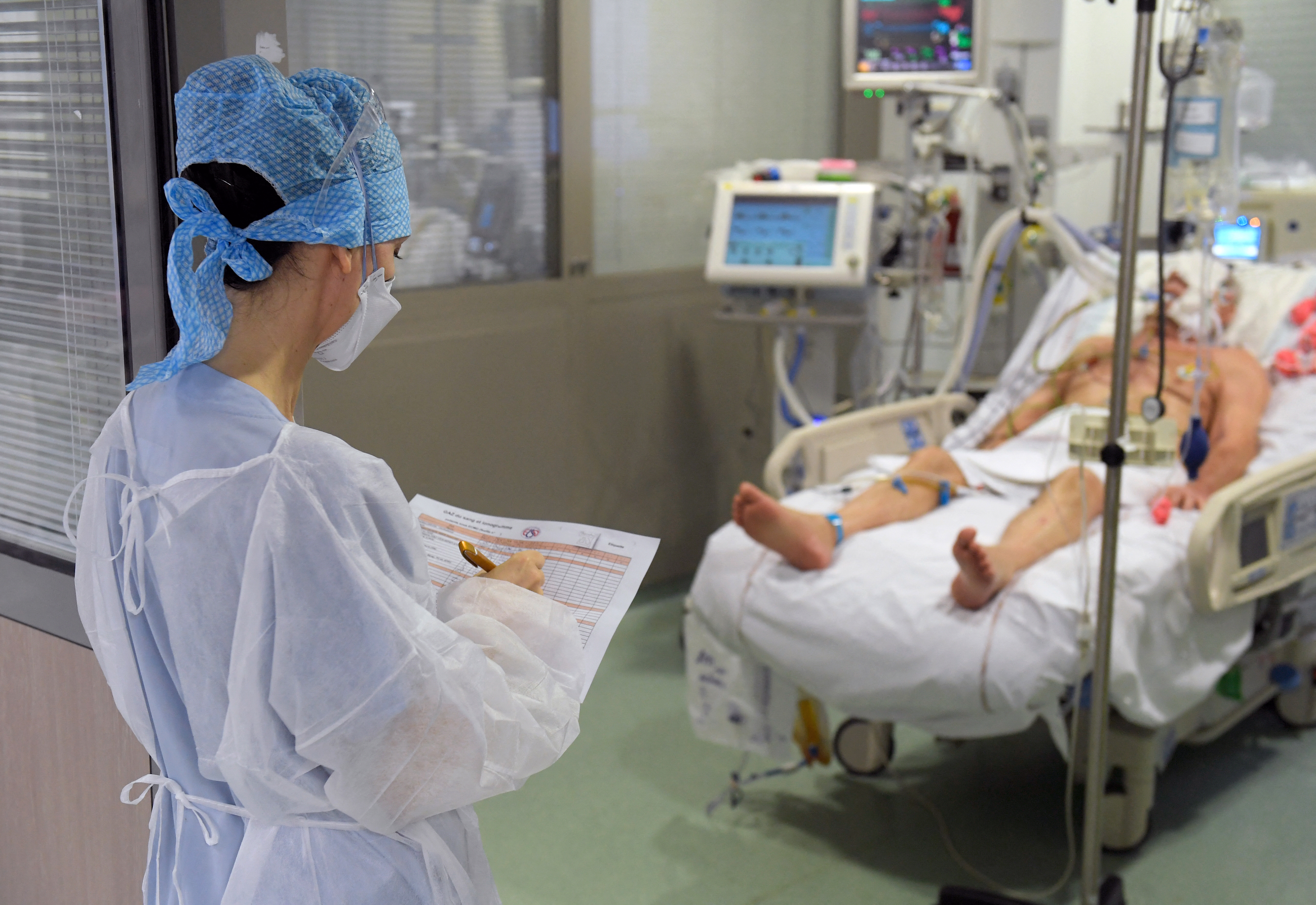 Patient en détresse respiratoire, en soins intensifs, hôpital Nord de Marseille, février 2021. © NICOLAS TUCAT / AFP