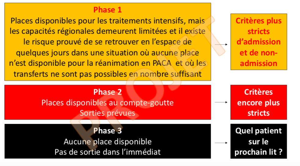 À ce jour, à l’issue de plusieurs réunions, les réanimateurs de Marseille ont envisagé trois phases. Pour la première, déjà en partie mise en place à Marseille, des « places [sont] disponibles pour les traitements intensifs mais les capacités régionales demeurent limitées et il existe le risque prouvé de se retrouver en l’espace de quelques jours dans une situation où aucune place n’est disponible pour la réanimation ».