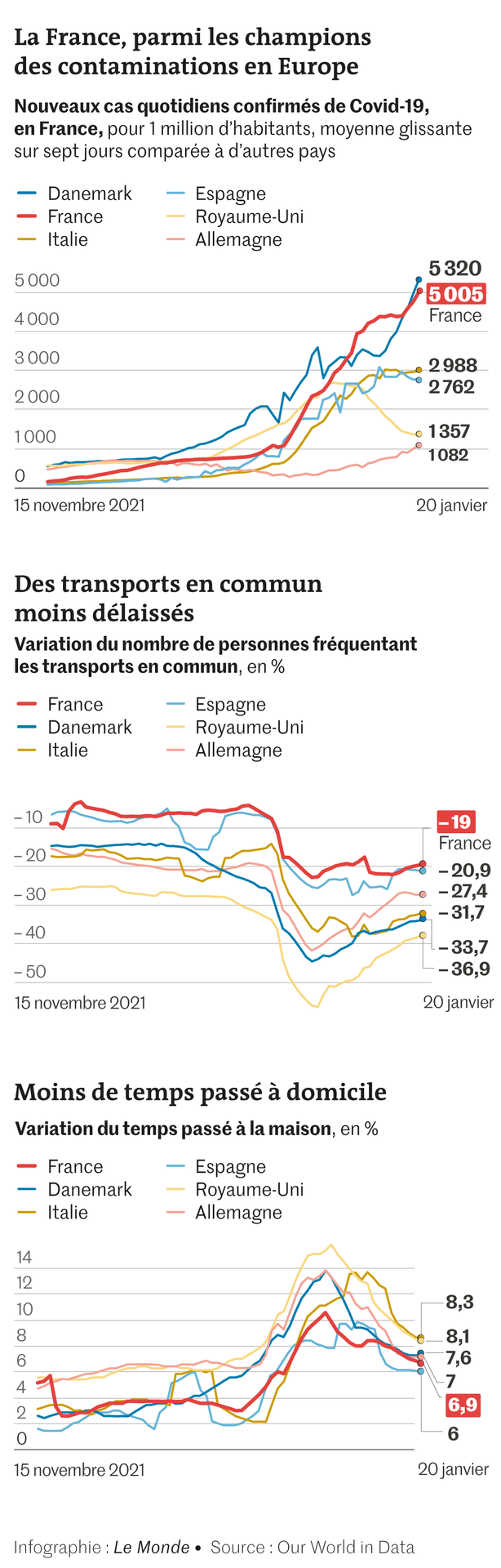 Deux indicateurs, collectés grâce aux données de mobilité de Google, en témoignent avec force. Le premier a mesuré la fréquentation des principales stations de transports collectifs : des six pays observés (France, Espagne, Suisse, Allemagne, Royaume-Uni et Suède), l’Hexagone est celui dans lequel la baisse est la plus faible. Les experts ont également suivi l’évolution du temps passé à domicile – de quoi observer les changements de pratiques vis-à-vis du travail, des loisirs et des courses. Les Espagnols, avec + 6,14 % au 17 janvier, ont moins modifié leurs comportements que nous (6,86 %). Mais tous les autres pays font mieux.