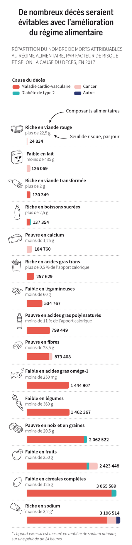 La sélection des facteurs de risque s’est appuyée sur les relations de cause à effet établies entre le niveau de consommation d’un aliment ou d’un nutriment (sodium, calcium…) et une maladie donnée. « Pour chacun de ces composants alimentaires, nous avons retenu un seuil d’exposition à risque », précise Ashkan Afshin.