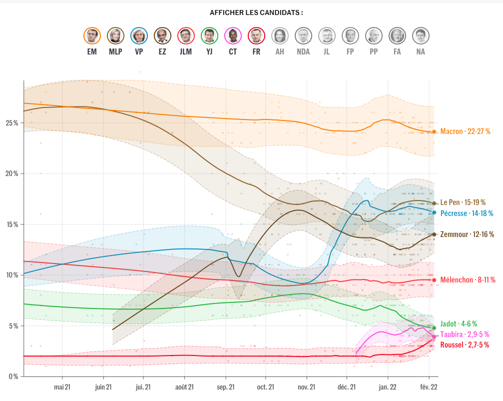 L’agrégateur ci-dessous a pour objectif de donner une vision synthétique de ces centaines de sondages. Il permet de visualiser l’évolution des intentions de vote pour chacun des candidats à la présidentielle, depuis le printemps de 2021. Le résultat de chacun de ces sondages est matérialisé par un point ; la courbe et les marges d’erreur de chaque candidat sont le résultat d’un calcul agrégeant les différents sondages.