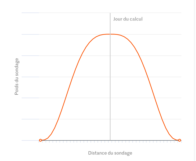 Chaque jour, l’algorithme de régression locale calcule une moyenne pondérée par la distance entre le jour considéré et la date de chacun des sondages prise en compte. Plus le sondage est éloigné dans le temps, moins il sera pris en compte. Ainsi, cette méthode permet de refléter rapidement les changements de tendances détectés.