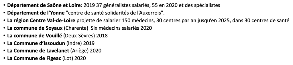 D’ailleurs, les élus et acteurs de terrain (Département, communautés de communes rurales, agglomérations ou certaines communes) ont souvent été les premiers à développer des solutions pragmatiques pour répondre aux besoins de leur population : définition d’aires de santé, élaboration d’une charte de non-concurrence entre collectivités infra-départementales, financement et création de MSP, création de CDS, salariat de praticiens médicaux…