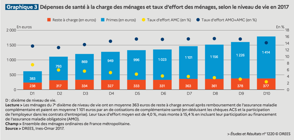 Les ménages les plus aisés ont des restes à charge plus élevés et souscrivent des complémentaires santé plus onéreuses