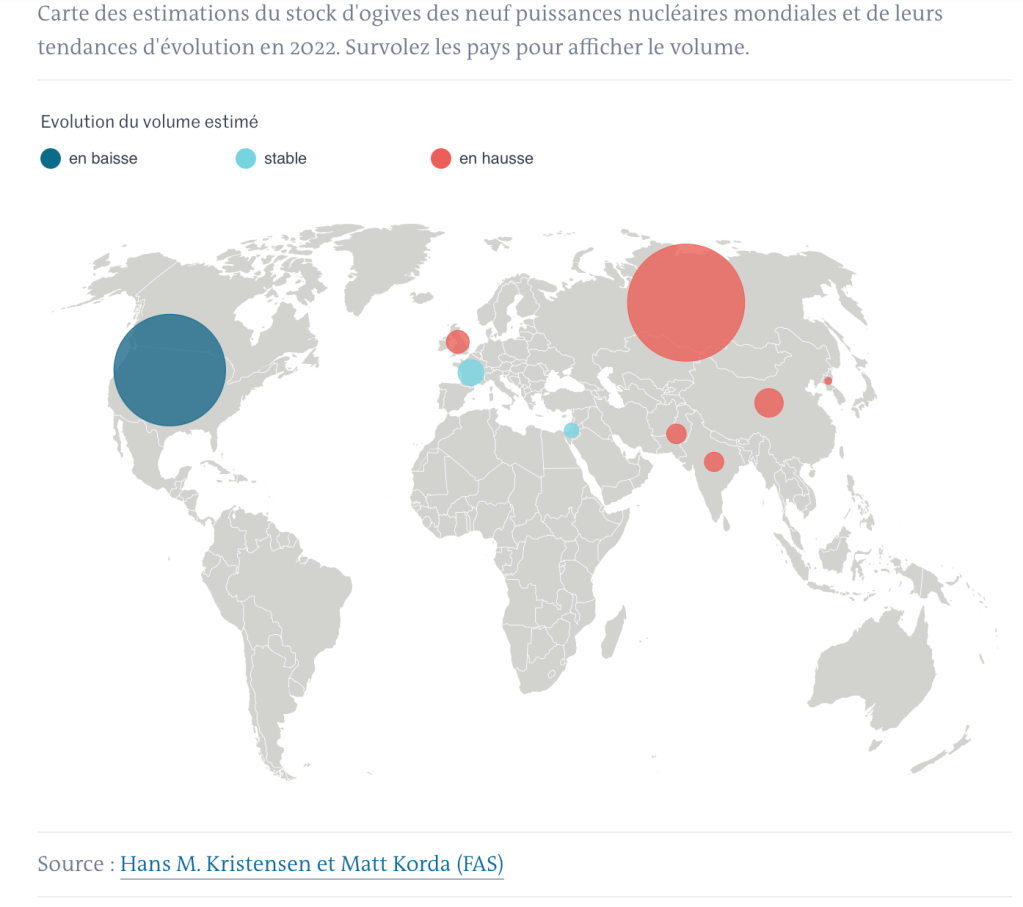 Carte des estimations du stock d’ogives des neuf puissances nucléaires mondiales et de leurs tendances d’évolution en 2022. Survolez les pays pour afficher le volume.
