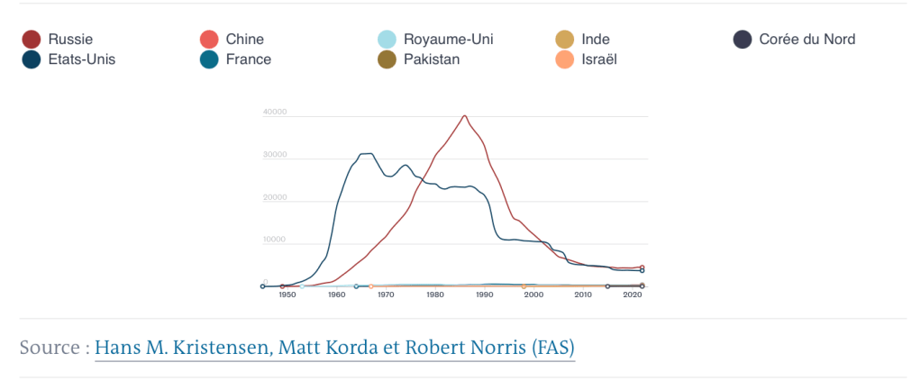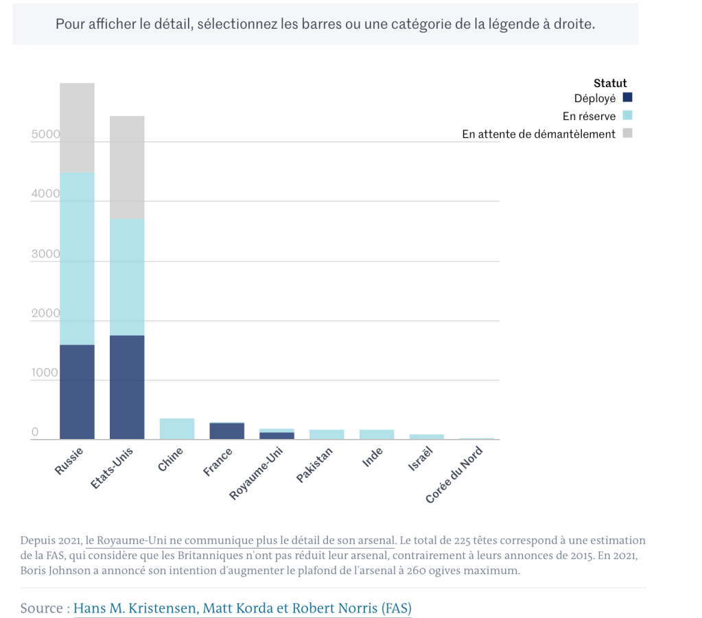 Le stock mondial d’ogives est réparti de manière très inégale entre les puissances nucléaires. La Russie et les Etats-Unis, protagonistes de la course aux armements lors de la guerre froide, en détiennent à eux deux environ 90 %. Chacun possède environ 4 000 charges nucléaires opérationnelles. Toutefois « la plupart des arsenaux de petite taille peuvent mettre fin à la civilisation telle que nous la connaissons », rappelle Benoît Pelopidas, fondateur du programme d’étude des savoirs nucléaires (Sciences Po, CERI).