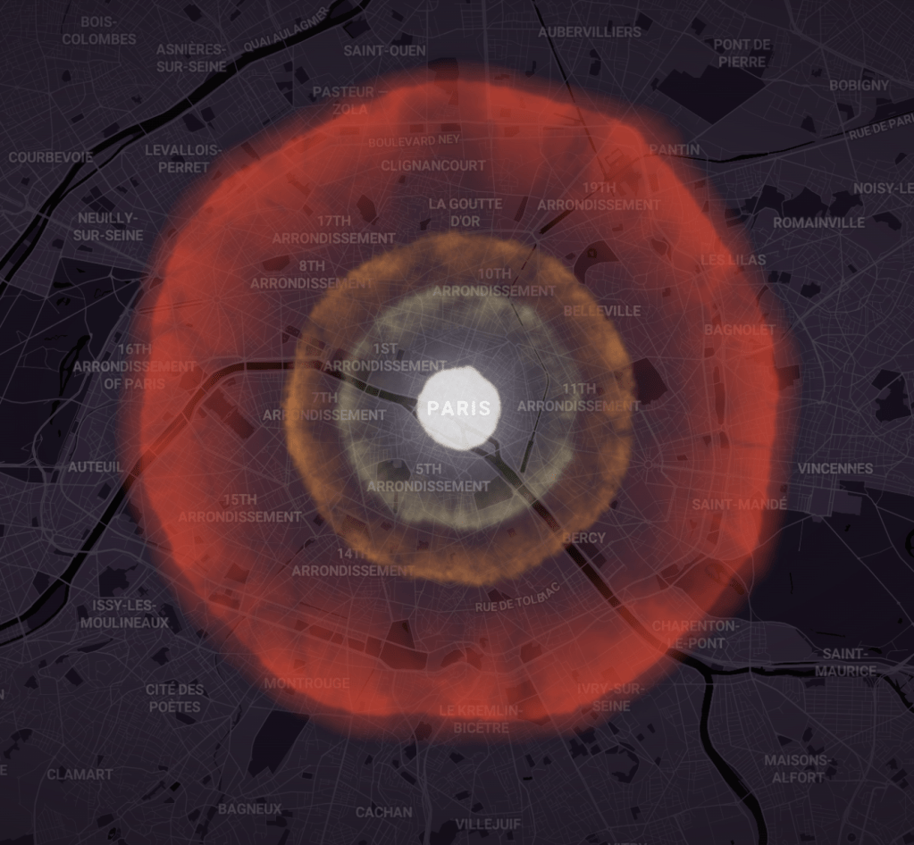 La fondation Outrider, qui milite contre la menace nucléaire, a mis en ligne un simulateur qui permet de se faire une idée de la zone touchée par une bombe nucléaire selon la puissance de celle-ci.