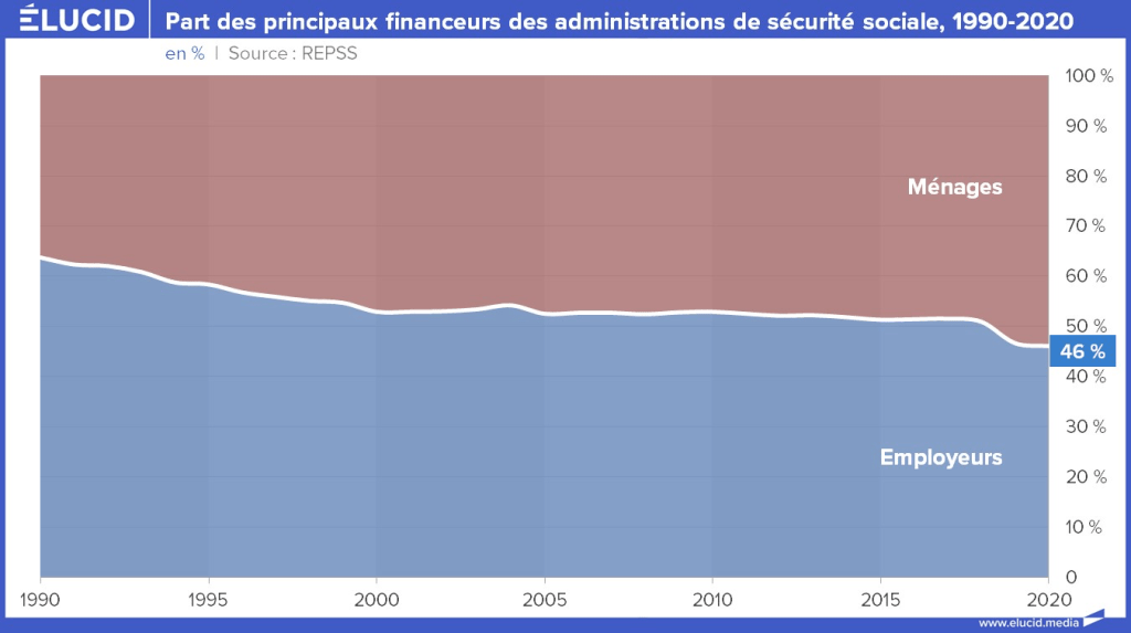 À cette évolution démographique s’ajoute une modification dans la répartition du financement de la sécurité sociale. On observe que sur longue période, les recettes de la sécurité sociale reposent de plus en plus sur les ménages au détriment des entreprises. Alors que les ménages ne contribuaient qu’à 36 % du budget de la sécurité sociale en 1990, ils en représentaient 54 % en 2020. C’est au nom des politiques de désinflation compétitive (aujourd’hui appelée « politique de compétitivité ») que les grandes entreprises en particulier ont bénéficié de régimes fiscaux favorables.
