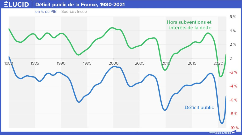 Si on recalcule le déficit public en tenant compte de la charge de la dette (déficit primaire) et des subventions aux entreprises, il apparaît que la France n’est pas en déficit chronique, puisque les deux seules périodes de déficit « réel » depuis les années 1980 se concentrent pendant la crise de 2008 et pendant la crise Covid de 2020.