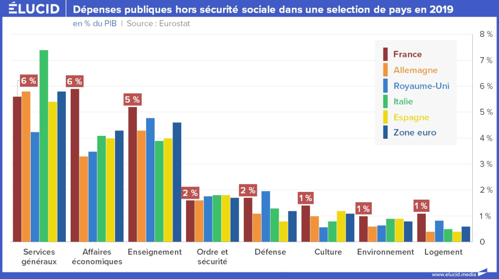 Hormis son poste des dépenses sociales, la France ne se distingue de ses voisins européens que par une importante part des dépenses consacrée au soutien à l’économie, principalement à destination des entreprises (cf. « Affaires économiques »). Autrement dit, le soutien aux entreprises est ce qui place la France en tête des dépenses publiques hors sécurité sociale.