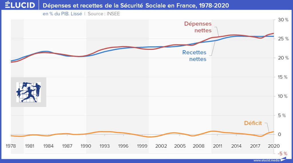 Près de la moitié des dépenses publiques sont consacrées à notre modèle de protection sociale. Elles correspondent à des dépenses de sécurité sociale comprenant majoritairement les dépenses de santé et les retraites, mais aussi plus marginalement les allocations chômage et les allocations familiales. Ces dépenses sont passées de 19 % du PIB en 1978 à plus de 26 % en 2020.