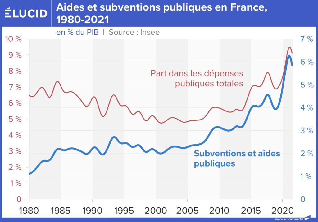 Cependant, la question démographique n’est pas la seule responsable de l’augmentation des dépenses publiques. Un autre mécanisme plus insidieux tient au fait qu’une part de plus ne plus importante des dépenses publiques est en fait consacrée à soutenir le secteur privé, sous forme de subventions et de crédits d’impôt. Ces aides et subventions publiques (destinées également à certains ménages) représentaient près de 120 milliards d’euros de dépenses en 2020, en forte augmentation depuis les années 2000. Elles représentaient alors 5 % des dépenses publiques totales contre 8 à 10 % aujourd’hui.