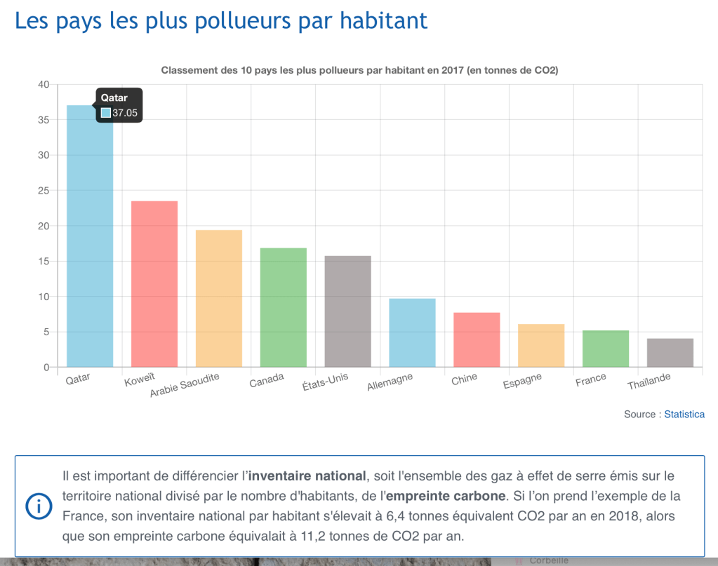 Il est important de différencier l’inventaire national, soit l’ensemble des gaz à effet de serre émis sur le territoire national divisé par le nombre d’habitants, de l’empreinte carbone. Si l’on prend l’exemple de la France, son inventaire national par habitant s’élevait à 6,4 tonnes équivalent CO2 par an en 2018, alors que son empreinte carbone équivalait à 11,2 tonnes de CO2 par an.