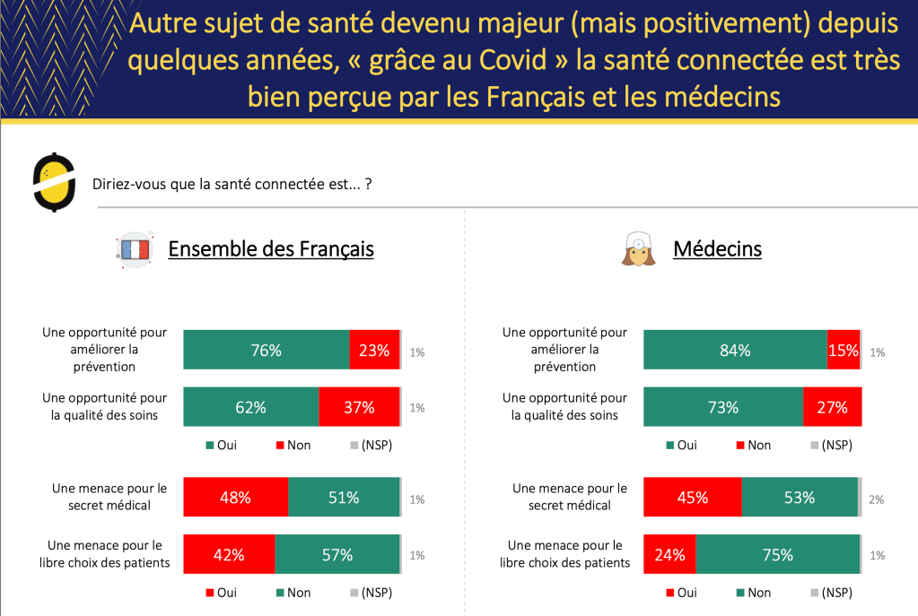 4) Plus positivement, la e-santé est devenue un autre sujet majeur en santé qui s’est imposé « grâce » au Covid : la téléconsultation a été multipliée par 4 en 2 ans (Doctolib recueillant 64% des utilisateurs) et la e-santé est désormais perçue comme une opportunité pour la qualité des soins par les Français (62%) et plus encore par les médecins (84%).