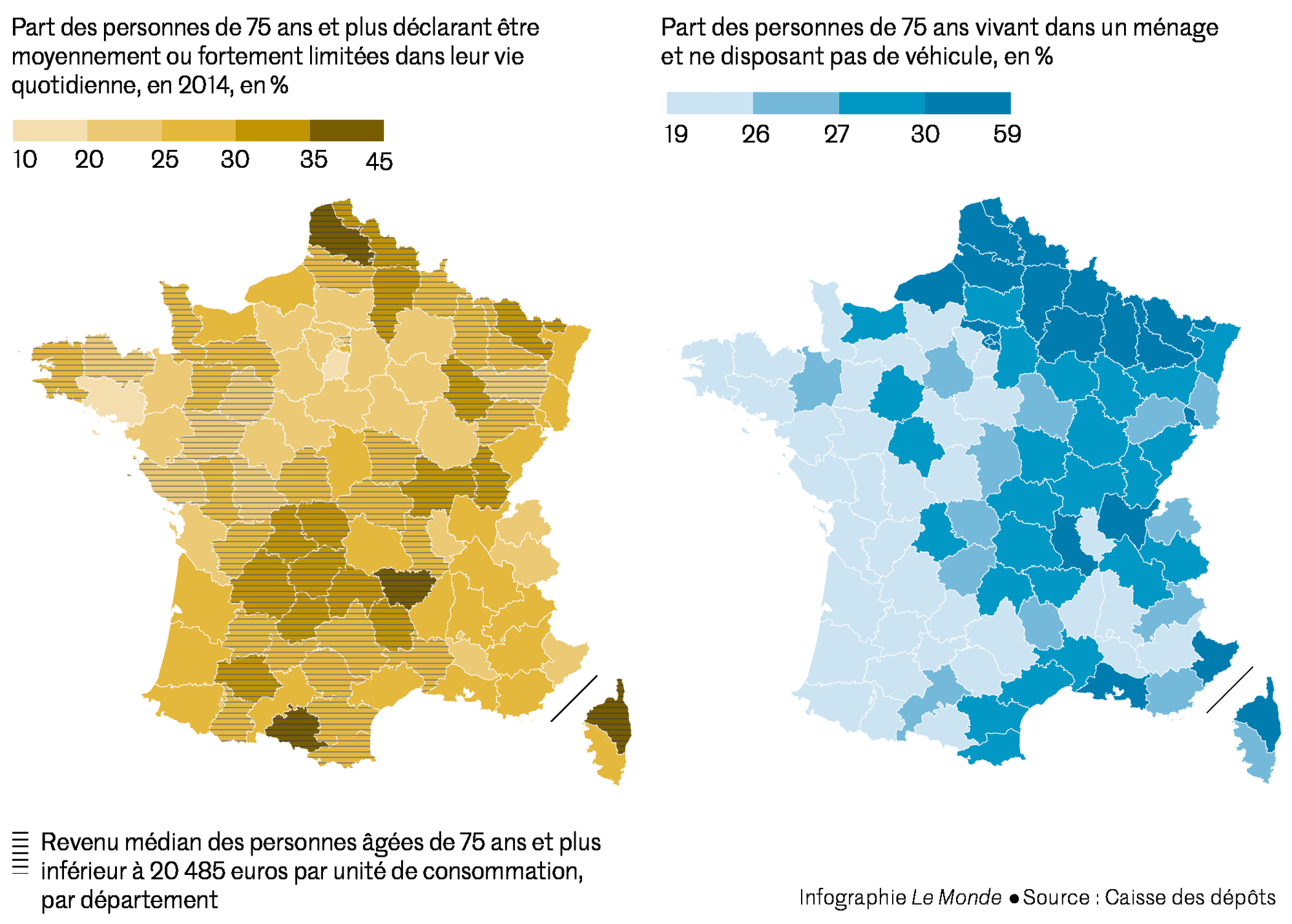 Ceux qui vivent dans les régions Hauts-de-France, Grand-Est et en Haute-Corse sont plus fréquemment en perte d’autonomie qu’en Bretagne, en Ile-de-France ou dans les Pays de la Loire. Les seniors de la France du Nord et de l’Est ont aussi, en moyenne, des revenus inférieurs à ceux du Sud et de l’Ouest. Ils sont moins souvent propriétaires et détenteurs d’une voiture. Ils cumulent les fragilités. Mais le soutien de leur famille est plus important que dans d’autres territoires. Dans le Massif central, le niveau de dépendance est à un niveau très élevé pour les plus de 75 ans, qui ont aussi de faibles revenus et vivent plus isolés.