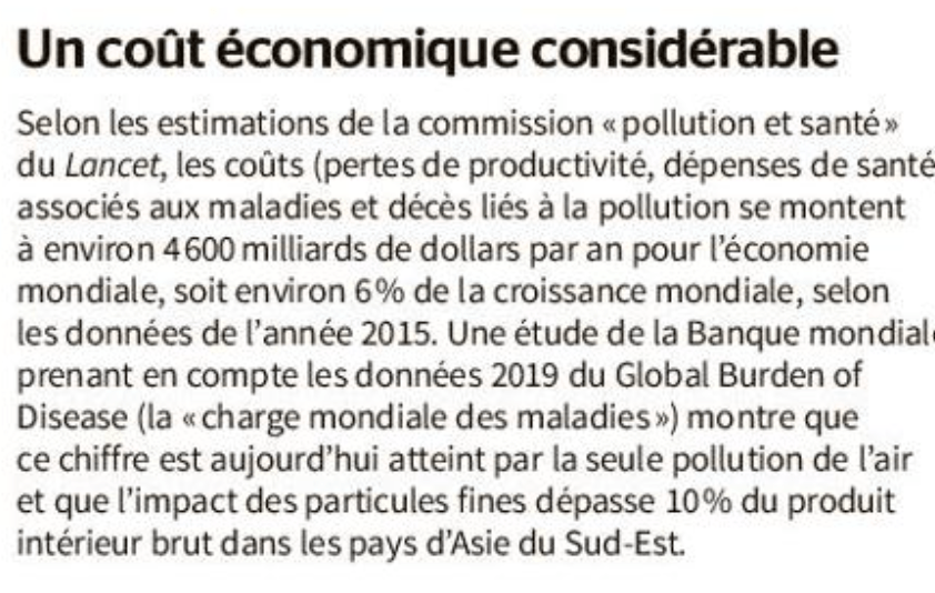 Car si aucune région du monde n’est épargnée, ce sont bien les pays pauvres qui paient le plus lourd tribut : plus de 90 % des décès sont concentrés dans des pays à revenus faibles et moyens. L’Asie du Sud (Inde, Pakistan, Bangladesh…) est particulièrement touchée. La pollution de l’air (extérieur et intérieur) est le premier facteur de risque : elle représente environ 75 % des décès. L’exposition aux particules fines et autres oxydes d’azote est ainsi à l’origine de 6,7 millions de morts prématurés chaque année. Un chiffre en hausse (+ 200 000) par rapport à l’estimation de la première étude. Une augmentation accrue par celle des victimes de la pollution de l’air extérieur dont le nombre a bondi de 2,9 millions à 4,5 millions en l’espace de deux décennies.Lire aussi Article réservé à nos abonnés L’exposition à un air pollué altère les fonctions mentales