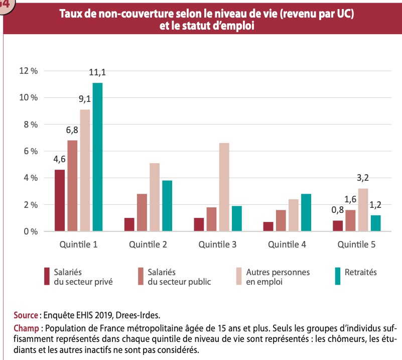La proportion de personnes sans couverture est multipliée par 3 parmi les retraités du premier quintile de niveau de vie (11 %), par 4 chez les chômeurs (14 %) et même par 6 (20 %) parmi les personnes au chô- mage depuis 12 à 24 mois.