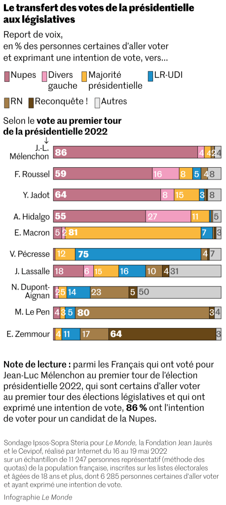 Chacun des trois pôles issus de la présidentielle semble aspirer les forces de son espace politique. Ainsi, une majorité d’électeurs de gauche à la présidentielle voteront pour une candidature Nupes aux législatives ; 86 % des électeurs de Jean-Luc Mélenchon sondés choisiront un bulletin Nupes le 12 juin. Une ombre au tableau demeure : les socialistes et les communistes sont les moins convaincus par l’alliance nouée autour du mot d’ordre « Mélenchon premier ministre » et d’un « programme partagé » où demeurent de nombreuses contradictions programmatiques, notamment sur l’Union européenne, la sortie du nucléaire ou encore des thématiques sociétales comme les violences policières.