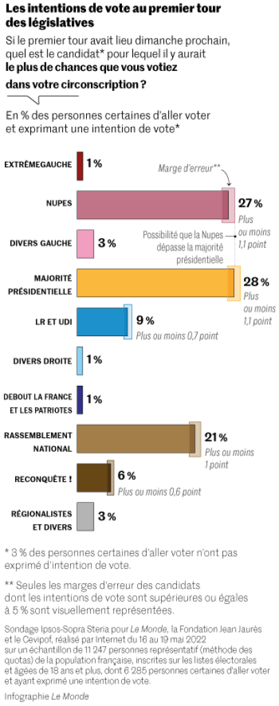 Les rapports de force issus du premier tour de l’élection présidentielle sont en passe de dessiner le profil de la prochaine Assemblée nationale. A trois semaines du premier tour des élections législatives, plus de 75 % des intentions de vote se répartissent entre la majorité présidentielle sous la bannière Ensemble (Renaissance, MoDem, et Horizons : 28 %, marge d’erreur de plus ou moins 1,1 point), la Nouvelle Union populaire, écologique et sociale (Nupes) – réunissant La France insoumise (LFI), Europe Ecologie-Les Verts (EELV), le Parti socialiste (PS) et le Parti communiste français (PCF), 27 %, même marge d’erreur – et le Rassemblement national (RN, 21 %, marge d’erreur de plus ou moins 1 point). Si l’on ajoute les voix que recueilleraient les candidats estampillés Reconquête !, le parti d’Eric Zemmour (6 %, marge d’erreur de plus ou moins 0,6 point), alors le bloc d’extrême droite représenterait environ 27 % des intentions de vote.