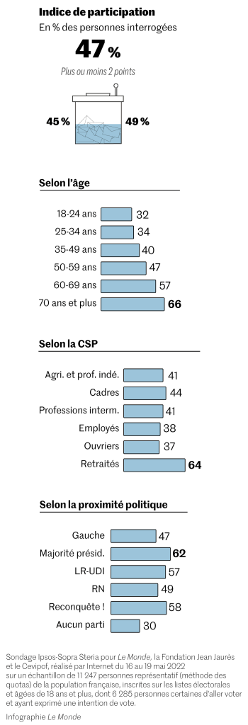 Ce sentiment de lassitude, que l’on mesurait déjà avant l’élection présidentielle, s’incarne également dans les projections de participation. L’intention d’aller voter au premier tour se situe entre 45 % et 49 %, soit un poids moyen de 47 %. Les moins de 25 ans sont ceux le moins enclin à aller voter (32 % chez les 18-24 ans et 34 % chez 25-34 ans) quand 66 % des 70 ans et plus iront placer un bulletin dans l’urne le 12 juin. L’union de la gauche ne semble pas avoir enrayé cette abstention différentielle.