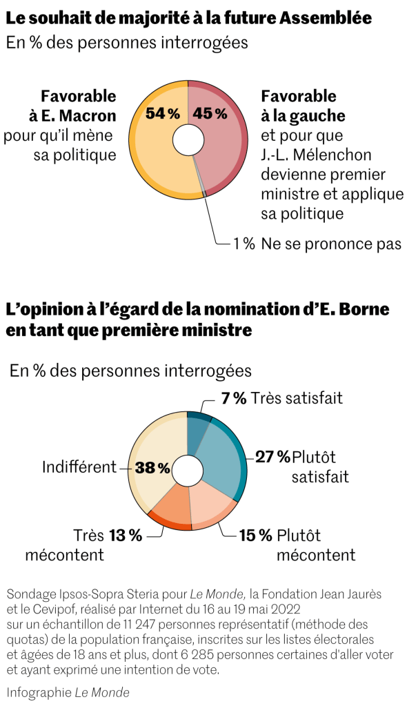 Si ces projections obéissent aux mécanismes amplificateurs du scrutin législatif à deux tours, le résultat ne reflète pas une volonté d’opposition au président de la République. Dans la logique des institutions, 54 % des personnes interrogées souhaitent qu’Emmanuel Macron obtienne une majorité à l’Assemblée et qu’il puisse appliquer sa politique. Mais elles sont 45 % à vouloir une cohabitation avec Jean-Luc Mélenchon. Ce désir de rééquilibrer les pouvoirs et surtout de tempérer celui du chef de l’Etat entre en résonance avec le mot d’ordre de la Nupes « d’envoyer Jean-Luc Mélenchon à Matignon ».