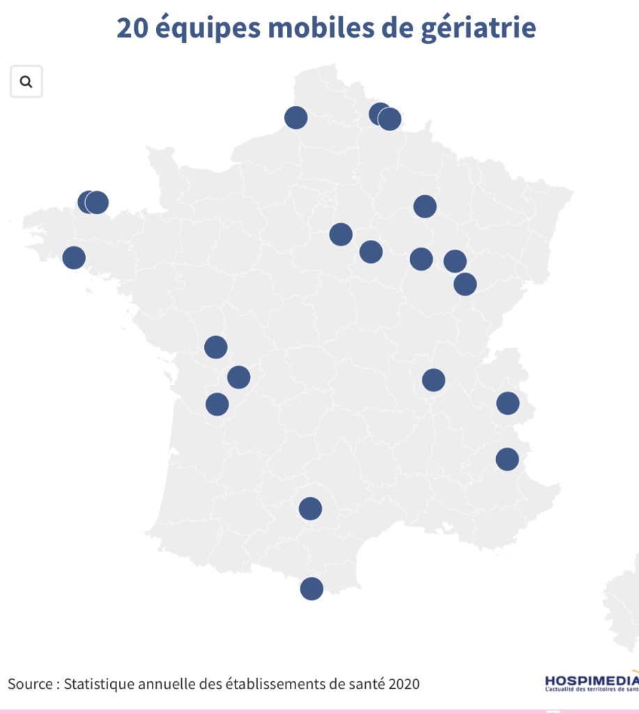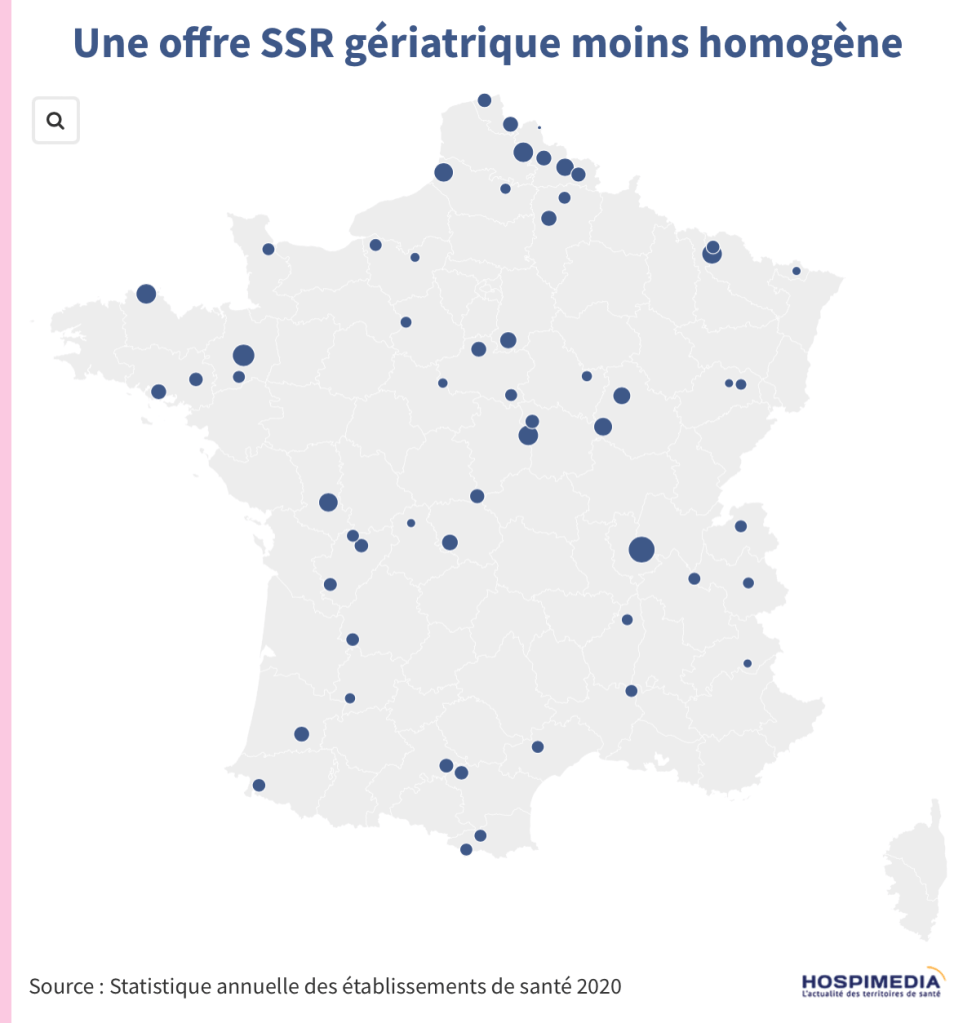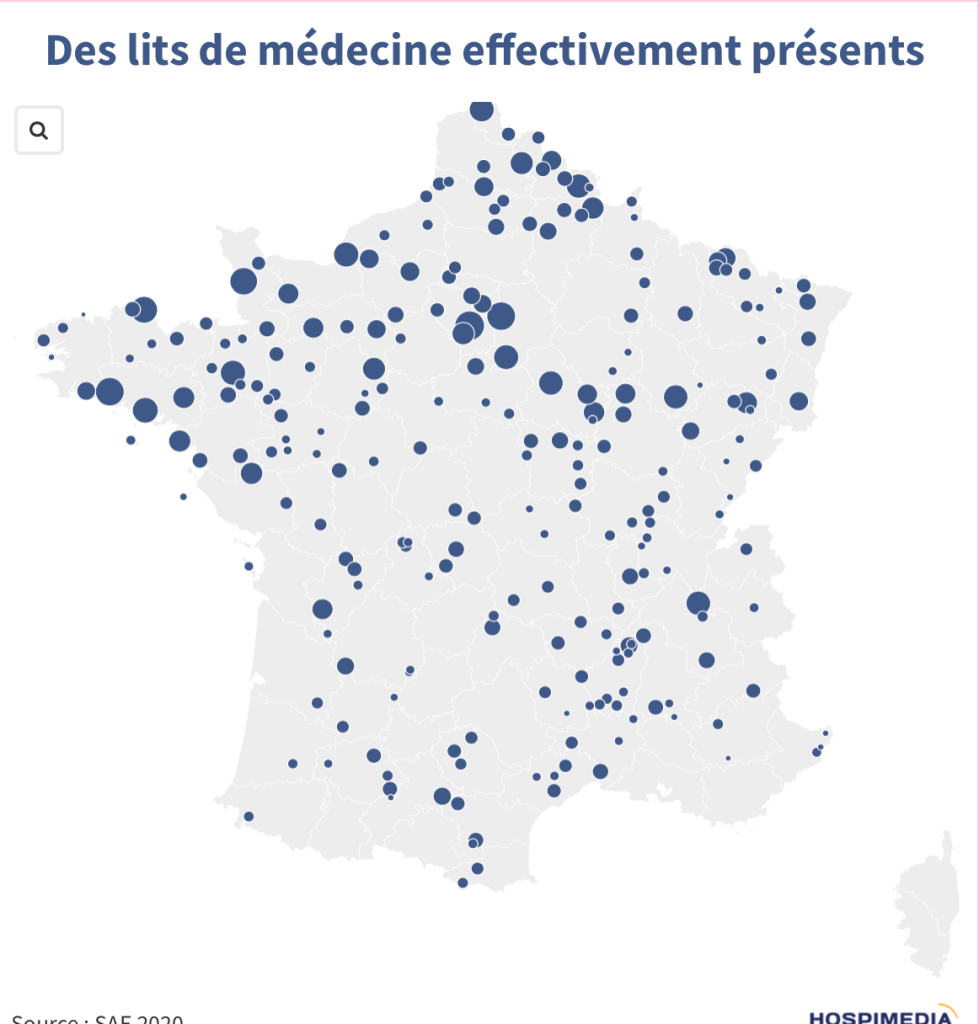 Premier critère pour l’obtention du label, l’autorisation de l’activité de médecine est effectivement renseignée en 2020 par la quasi-unanimité des établissements. Au total, ils cumulent 6 133 lits et 290 places d’hospitalisation de jour. Avec 98 lits et 10 places, l’Hôpital Forcilles à Férolles-Attilly (Seine-et-Marne), nouvellement labellisé, est le plus doté. À l’autre bout du spectre se trouve le CH de Riez (Alpes-de-Haute-Provence) avec 4 lits. Une offre plus spécialisée en gériatrie est également en place avec 981 lits répartis dans 51 établissements, et 53 places dans 13 hôpitaux de proximité. Via la SAE, Hospimedia comptabilise également 20 équipes mobiles de gériatrie.