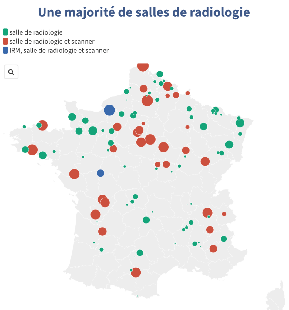 La réforme des hôpitaux de proximité vise à renforcer l’offre d’imagerie et de biologie dans les territoires en dotant les établissements. L’activité de biologie est moins identifiable dans la SAE. En revanche, en matière d’imagerie, les hôpitaux labellisés lors de cette première campagne cumulent, en 2020, 154 450 actes pour les patients accueillis et 604 936 actes externes. Seulement deux, à savoir les CH de Loudun (Vienne) et Pont-Audemer (Eure), disposent d’un appareil IRM et 33 sont équipés d’un scanner. L’activité est surtout déployée dans des salles de radiologie conventionnelle, avec 109 hôpitaux de proximité concernés, soit un peu moins de la moitié des établissements.