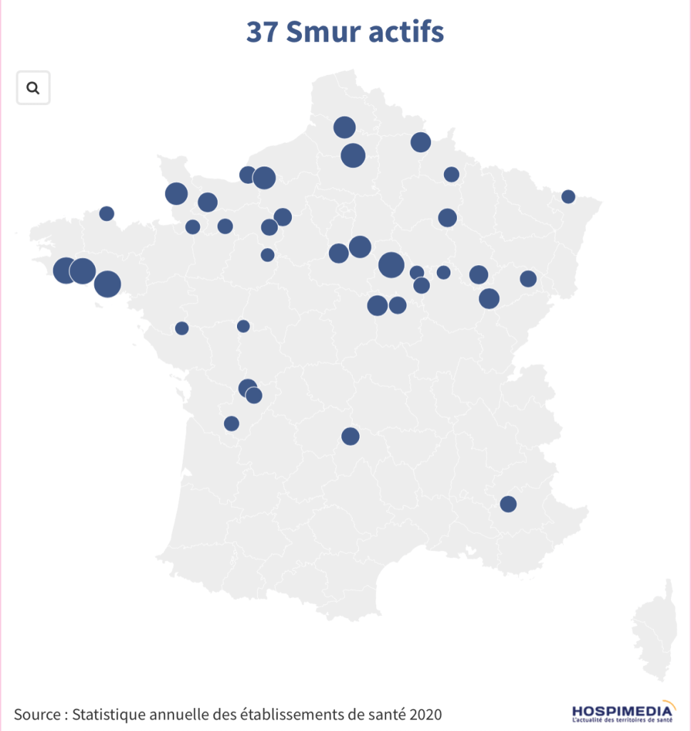L’activité des services d’urgences et des services mobiles d’urgence et de réanimation (Smur) concerne une proportion moindre d’hôpitaux de proximité. 51 établissements sont ainsi recensés. Ils cumulent 18 480 sorties Smur et 515 081 passages aux urgences selon les données 2020. Avec plus de 900 sorties par an, les Smur des CH d’Auray (Morbihan), Concarneau (Finistère) et Joigny (Yonne) et de l’hôpital La Villeneuve du groupe hospitalier Sud-Bretagne (Finistère) sont les plus actifs. Concernant les services d’urgences, le CH d’Eu (Seine-Maritime) comptabilise le plus de passages (23 790), alors que la moyenne des services concernés est de presque 11 000 passages annuels. La quasi-totalité dispose d’une unité d’hospitalisation de courte durée, d’une capacité de 2 à 7 lits selon les établissements.