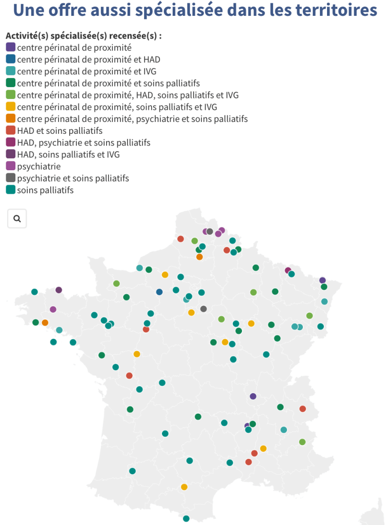 Enfin, certains établissements disposent déjà d’une offre étoffée avec des spécificités. Les hôpitaux de proximité jouent un rôle en matière de périnatalité. Si les fermetures de maternités locales ont été nombreuses dans les territoires, seulement 44 centres périnataux de proximité sont recensés. La pratique des interruptions volontaires de grossesse est également plutôt minoritaire, puisqu’elle concerne 20 établissements. Seulement 9 déclarent des lits spécialisés en psychiatrie tandis que 15 disposent d’une HAD. Enfin, la présence d’une équipe mobile de soins palliatifs est plus courante. Hospimedia en recense 49 dans la SAE 2020. Certains établissements disposent également d’une activité autorisée en soins palliatifs, qui vient compléter ou est indépendante de l’offre mobile.