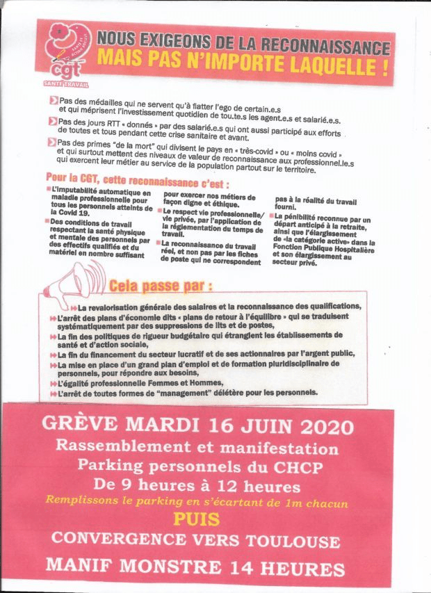 Rassemblement et manifestation parking personnels du CHCP de 9 H à 12 H. Puis convergence vers Toulouse : Manifestation à 14 H.