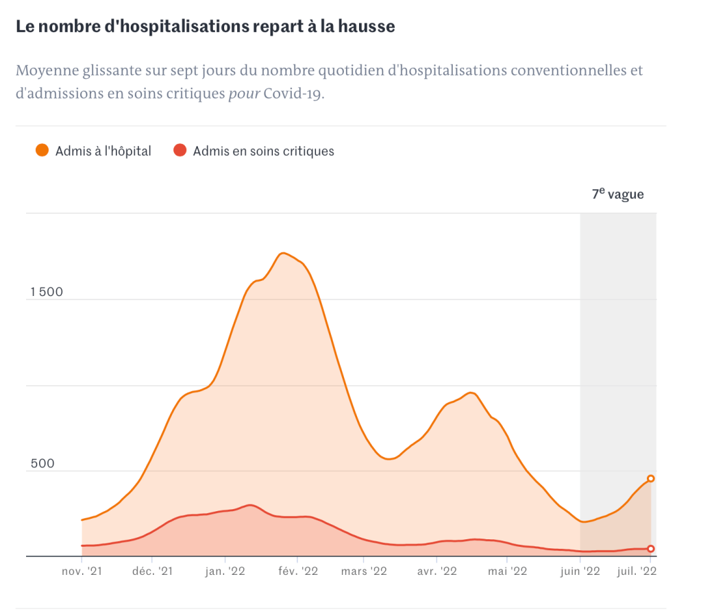 Mais quand les transmissions du virus augmentent, le nombre de formes sévères nécessitant une hospitalisation progresse logiquement. Il existe toutefois une période de latence entre les contaminations et un éventuel effet sur les admissions à l’hôpital. Les contaminations ayant nettement augmenté dans les derniers jours, il est à craindre que l’effet sur l’hôpital se fasse ressentir davantage dans les prochains jours.