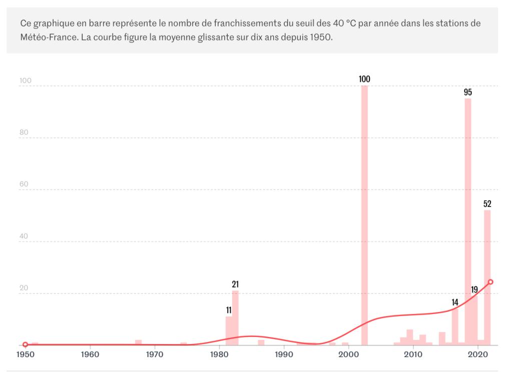 Temps de Lecture 1 min. https://www.lemonde.fr/les-decodeurs/article/2022/08/05/climat-en-france-depasser-les-40-c-devient-la-norme_6137287_4355770.html