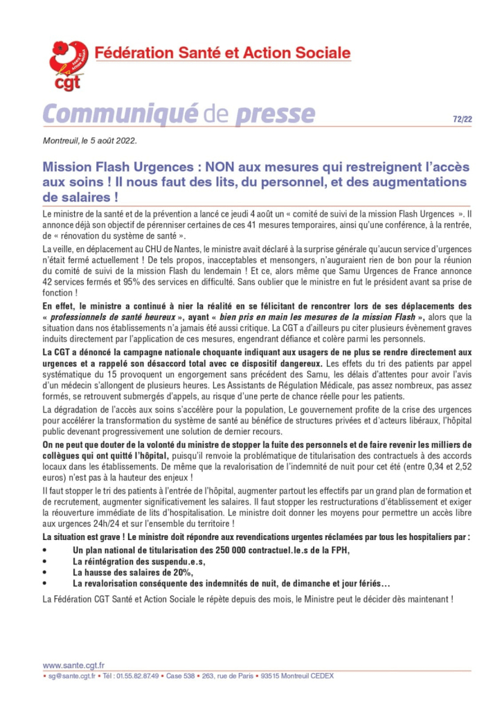 Pour éviter d’arriver à une « situation explosive » et l’éventualité « de nouveaux départs de personnels médicaux », le SUdF recommande de poursuivre le déploiement des mesures de la « mission flash », dévoilées à la fin du mois de juin, ainsi que de modifier l’organisation des lits d’aval des urgences ou encore de revoir la rémunération du personnel.