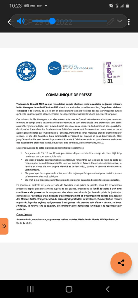 Avec le manque de places en foyers, beaucoup se retrouvent donc à la rue. C’est le cas de Traoré, 16 ans, originaire de Guinée-Conakry. Son dossier en attente, il est cependant inscrit dans un lycée privé pour la rentrée et va y suivre un CAP plomberie. Arrivé en France avec un acte de naissance prouvant sa minorité, il« attend des nouvelles de l’avocat. Ce soir, je vais encore dormir sur la pelouse », dit-il. Des professeurs bénévoles de l’association Tous-tes en classe 31 et l’ONG Médecins du monde ont amené les premières bouteilles d’eau et cartons de nourriture en début de week-end. « Mais on ne trouvera jamais aussi rapidement des hébergements solidaires et une solution pour tous », se désolait, dimanche 28 août, Barbara, bénévole à AutonoMIE.
