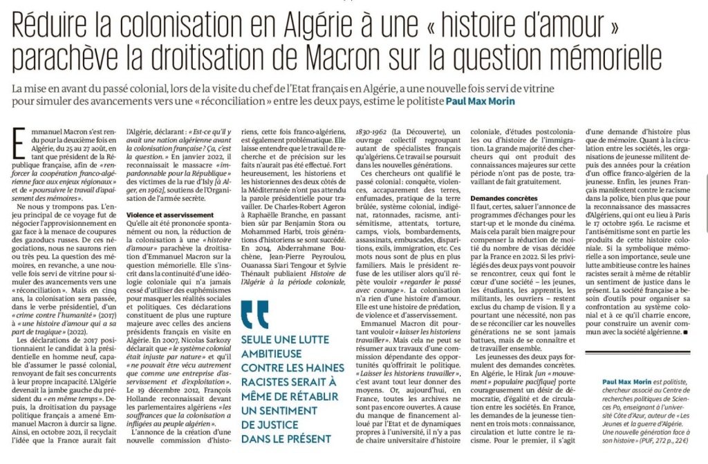 Paul Max Morin est docteur en science politique, chercheur associé au Cevipof et enseignant à Sciences Po, il travaille sur la mémoire de la guerre d’Algérie chez les jeunes et collabore à plusieurs projets scientifiques, pédagogiques et culturels sur ce sujet. Il a déjà publié en 2021 une tribune dans le Monde et été plusieurs fois cité dans des articles de ce quotidien. Il écrit dans cette tribune que le discours présidentiel sur la colonisation — qui, à tout le moins, fait partie du passé franco-algérien puisqu’elle a marqué la période de 1830 à 1962 — est passé de la qualification en 2017 de « crime contre l’humanité », à celle, en 2022, d’« histoire d’amour qui a sa part de tragique ». Cette formule a été employée à deux reprises par le président de la République durant son voyage en Algérie, puisqu’il l’a répétée en s’adressant aux ressortissants français reçus à l’ambassade de France à Alger. Paul Max Morin est dans son rôle lorsqu’il donne son commentaire sur son usage, dans une tribune qu’il signe de son nom et qui peut être discutée ou contredite par quiconque ne partage pas son point de vue. Mais, quelques heures après la distribution du quotidien, elle a été supprimée du site internet du journal.