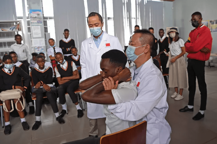 Des médecins de l’équipe d’aide médicale chinoise en Namibie effectuant une démonstration de massage chinois devant des étudiants de l’école secondaire le président Mao Zedong à Windhoek, le 3 novembre dernier. (Xinhua/Chen Cheng)
